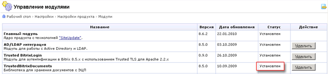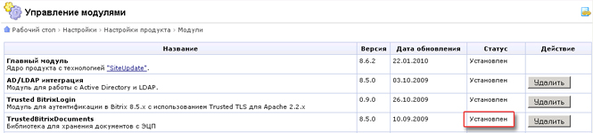 Весь необходимый функционал TLS-аутентификации и ЭЦП реализован с помощью двух специально разработанных модулей: TrustedBitrixLogin и TrustedBitrixDocuments (модули разрабатывались для продуктов «1С-Битрикс», начиная с версии 8.5.).